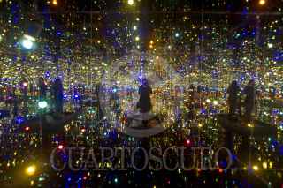 Una cabina para una persona con espejos y luces hace el efecto de luces infinitas, en un centro comercial de Monterrey.