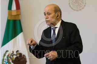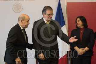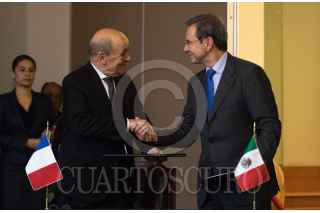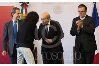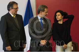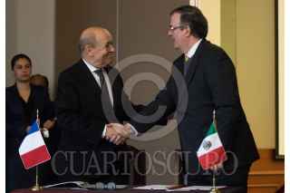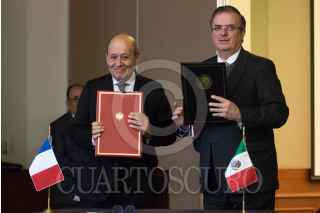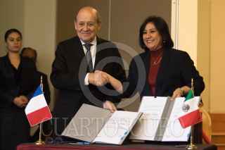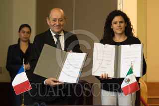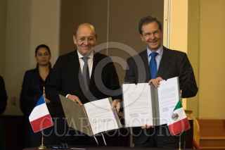 Jean-Yves Le Drian, Ministro de Asuntos Exteriores de Francia, y Marcelo Ebrard Casaubón, Secretario de Relaciones Exteriores, encabezaron la firma de convenios entre éstos gobiernos, también suscribieron acuerdos la Secretaria de la Función Pública, Irma Erendira Sandoval; Luisa María Alcalde Luján, secretaría del Trabajo y Previsión Social, y Esteban Moctezuma, secretario de Educación Pública. Entre los acuerdos esta la enseñanza del idioma francés en los planteles educativos públicos de Educación Básica en el nivel secundaria, en un inició como un programa piloto en 34 escuelas de todo el país. FOTO: MOISÉS PABLO/CUARTOSCURO.COM