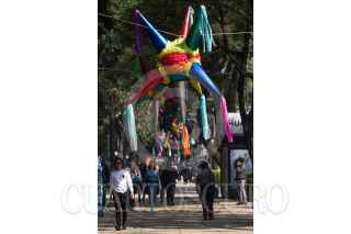 Enormes piñatas adornan las banquetas de Paseo de la Reforma. Estas artesanías efímeras son parte del colorido de las posadas navideñas, que tiene un significado místico ya que se piensa que a través de ellas se elimina el mal cuando se rompen. FOTO: MOISÉS PABLO/CUARTOSCURO.COM
