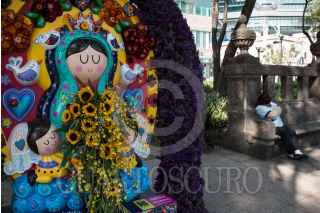 Una mujer duerme en una de las bancas de Paseo de la Reforma, donde por fechas conmemorativas al día de la Virgen de Guadalupe se encuentran expuestas las esculturas “Las virgencitas” de la marca Distroller creada por Amparín Serrano. La exposición estará hasta el 6 de enero. FOTO: ANDREA MURCIA /CUARTOSCURO.COM
