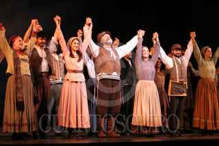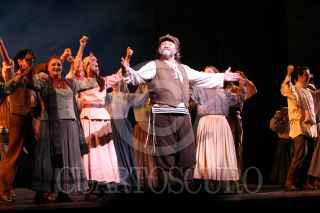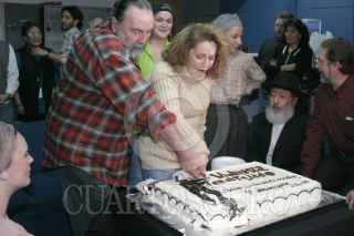 MEXICO, D.F., 09NOVIEMBRE2005.- Morris Gilbert, productor de teatro y Pedro Armendaríz, cortaron un pastel como parte de la celebración de un año de representaciones de El Violinista en el Tejado, que se presenta en el Centro Cultural Telmex. FOTO: Moisés Pablo/CUARTOSCURO.COM
