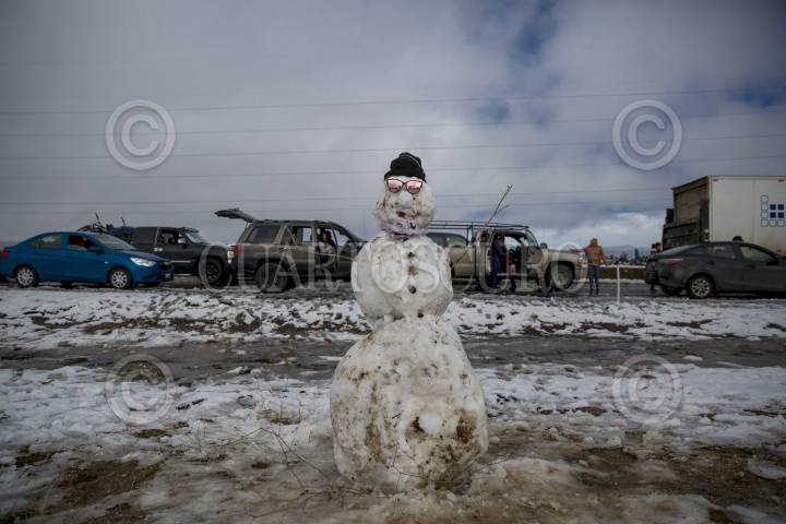 Los tramos carreteros que comunican los municipios de Tecate y Mexicali, en Baja California, presentaron cierres tras la intensa nevada que cayó en la zona montañosa, a la altura del poblado de la Rumorosa, esto tras el paso del frente frío número 26, mismo que se aparejó a la cuarta tormenta invernal que afecta el noroeste de México. Ciudadanos de la localidad se protegieron con ropa de invierno y salieron de los automóviles a disfrutar de este suceso, FOTO: OMAR MARTÍNEZ /CUARTOSCURO.COM