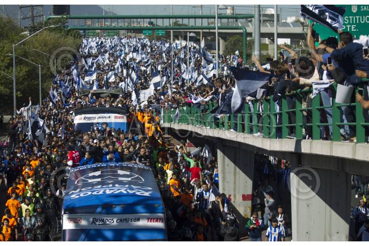 Aficionados de los Rayados del Monterrey asisten al desfile por avenidas de la ciudad en apoyo a su equipo. Jugadores Rayados celebran el campeonato, apertura 2019.