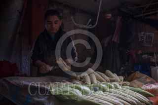 Comerciantes del mercado de la Merced ofrecen elote desgranado para preparar los platillos para la cena de año nuevo. FOTO: MAGDALENA MONTIEL /CUARTOSCURO.COM