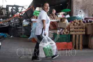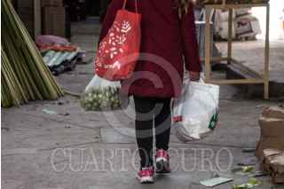 Desde el primero de enero del año en curso entro en rigor la reforma del artículo 25 de la Ley de Residuos Sólidos, aprobada por el Congreso de la Ciudad de México, en la cual se prohíbe la comercialización, distribución y entrega de bolsas de plástico al consumidor en los puntos de venta de bienes o productos. Las multas por infringir la Ley van de 37 mil pesos a 150 mil 980 pesos y se comenzaran a aplicar desde el 15 de enero. En la imagen una mujer camina con sus productos en una bolsa de plástico. FOTO: ANDREA MURCIA /CUARTOSCURO.COM