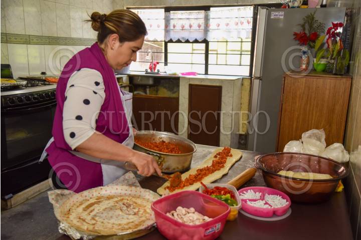 La Familia Mejia realiza cada año roscas tradicionales pero este año decidieron innovar y adaptaron la masa rellenándola con carne al pastor; la compartieron con sus familiares y llegaron a las redes sociales, ahora para festejar el Día de Reyes les han llegados muchos pedidos de este tipo de rosca; la base es masa dulce-salada, rellena de carne al pastor, hawaiana y campestre, adornada con chile pimiento morron y champiñones y tres muñecos en cada rosca, que alcanza para 8 personas. Con su negocio familiar Banquetes Delicias han estado surtiendo pedidos desde el 30 de diciembre del año pasado y para este 6 de enero serán los pedidos más grandes para festejar en los hogares mexiquenses. FOTO: CRISANTA ESPINOSA AGUILAR /CUARTOSCURO.COM