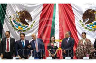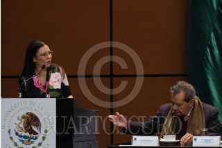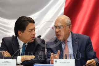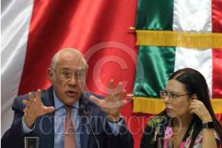 Reginaldo Sandoval, coordinador por el Partido del Trabajo; Mario Delgado, coordinador de Morena; José Ángel Gurría Treviño, secretario General de la Organización para la Cooperación y el Desarrollo Económicos (OCDE); Laura Rojas, presidenta de la mesa directiva en la Cámara de Diputados; Marco Antonio Adame, vicepresidente por el partido del PAN, Y Dulce María Sauri, vicepresidenta del PRI, durante la conferencia " La Inclusión, la Sustentabilidad y el Bienestar como imperativos de crecimiento", la cual se realizó en el Salón de Legisladores de la República, en la Cámara de Diputados. FOTO: GRACIELA LÓPEZ /CUARTOSCURO.COM