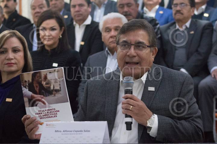 Alfonso Cepeda Salas, secretario General de la SNTE y Gregorio Jorge Rodríguez, presidente del Comité Nacional Electoral, durante la presentación del Reglamento para la Elección de Directivas Seccionales, en el Sindicato Nacional de Trabajadores de la Educación, ubicada en calle Venezuela, Centro Histórico. FOTO: MAGDALENA MONTIEL/CUARTOSCURO.COM