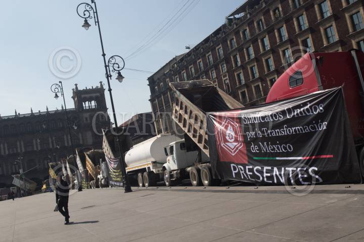 Chóferes de camiones de carga que integran el Sindicatos Unidos por la Transformación de México se manifestaron en el Zócalo, en donde desde temprana hora llevaron sus unidades para protesta por que exigen que el gobierno federal los tome en cuenta en la construcción del nuevo aeropuerto Felipe Ángeles, cuya construcción esta a cargo de la SEDENA. FOTO: MOISÉS PABLO/CUARTOSCURO.COM