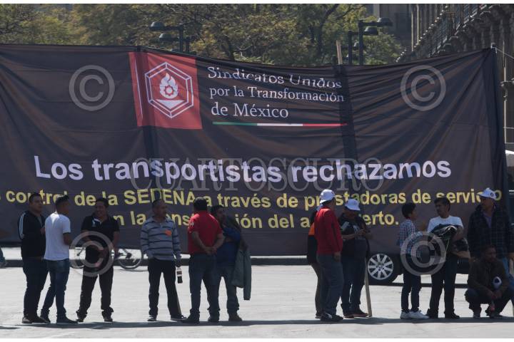 Chóferes de camiones de carga que integran el Sindicatos Unidos por la Transformación de México se manifestaron en el Zócalo, en donde desde temprana hora llevaron sus unidades para protesta por que exigen que el gobierno federal los tome en cuenta en la construcción del nuevo aeropuerto Felipe Ángeles, cuya construcción esta a cargo de la SEDENA. FOTO: MOISÉS PABLO/CUARTOSCURO.COM