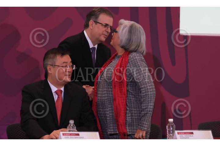 CIUDAD DE MÉXICO, 13ENERO2020.- Zhu Qingquiao, embajador de China en México; Graciela Márquez, secretaria de Economía, y Marcelo Ebrard, secretario de Relaciones Exteriores, encabezaron la Ceremonia inaugural del "Día de China". El acto se realizó en las instalaciones de la Secretaria de Economía. FOTO: GRACIELA LÓPEZ /CUARTOSCURO.COM