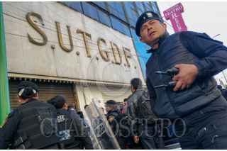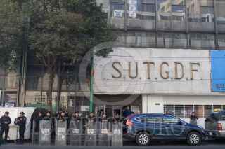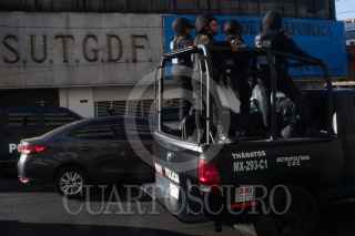 El nuevo líder Hugo Alfredo Alonso Ortiz tomó oficialmente las instalaciones del Sindicato Único de Trabajadores del Gobierno de la Ciudad de México (SUTGCDMX), luego de ganar las elecciones el jueves pasado con amplio margen sobre su contrincante, Armando Bautista Ramírez. Elementos de la Secretaría de Seguridad Ciudadana montaron un dispositivo de seguridad en las inmediaciones del inmueble ante posibles confrontaciones entre seguidores de ambas planillas, sin embargo no hubo tal. FOTO: MOISÉS PABLO/CUARTOSCURO.COM
