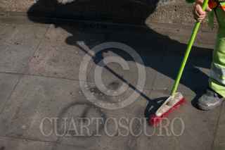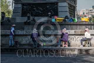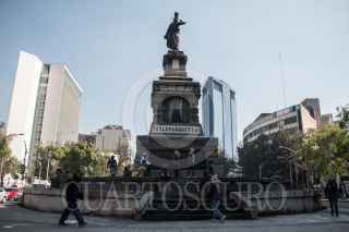 Trabajadores de limpieza en coordinación con la dirección general de Sitios y Monumentos del Patrimonio Cultural, trabajan en los últimos detalles del mantenimiento y restauración del Monumento a Cuauhtémoc, el cual esta dedicado al Huey Tlatoni mexica, ubicado en el cruce de la Avenida de los Insurgentes y Paseo de la Reforma; obra de Francisco M. Jiménez con esculturas de Miguel Noreña. Las restauraciones a monumentos del Paseo, Eje 2 Norte y 2 Poniente, comenzaron en julio del año pasado con el fin de resarcir su deterioro. Fue el 16 de agosto donde durante marcha feminista fueron grafiteados y maltratados como protesta por los feminicidios y desapariciones de mujeres sin resolver. FOTO: ANDREA MURCIA /CUARTOSCURO.COM