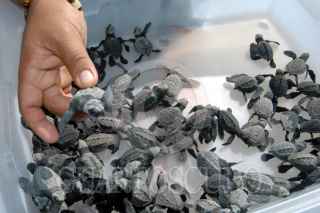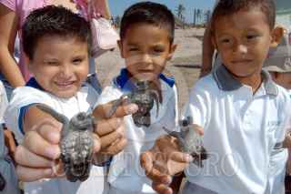 ACAPULCO, GUERRERO 12NOVIEMBRE2005.- Alrededor de 310 Tortugas Laúd fueron liberadas de un día de nacidas en el campamento tortuguero de PLaya Larga como parte del Programa ecológico de la dirección de la coordinación de educación ambiental de la Policía Ecológica de Acapulco FOTO: Eric Miralrío/CUARTOSCURO.COM