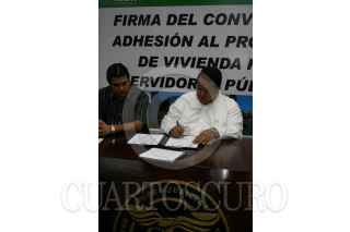 VILLAHERMOSA, TABASCO, 17NOVIEMBRE2005.- En el edificio del Tribunal Superior de Justicia se llevò a cabo la Firma del Convenio de Adhesiòn de Vivienda para Servidores Públicos, en la cual Manuel Andrade Díaz, gobernador del estado, firmó como testigo, constatado por el Presidente Magistrado Guillermo Narvaez Osorio. FOTO: Marco Polo Guzmàn/CUARTOSCURO.COM