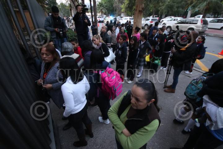 TORREÓN, COAHUILA, 17ENERO2020.- Tras el tiroteo, obra de un alumno de 11 años, que tuvo como saldo dos fallecidos y seis lesionados. El Colegio Cervantes reanudó actividades con un fuertes operativo de seguridad, que incluyó detectores de metales y revisión a los estudiantes al momento de entrada. FOTO: ALEJANDRO RODRÍGUEZ/CUARTOSCURO.COM