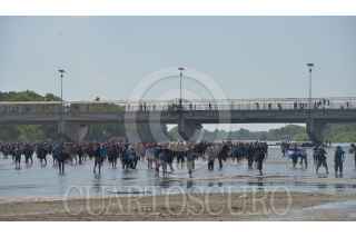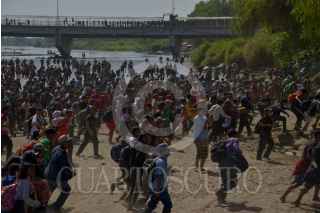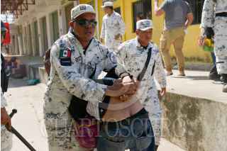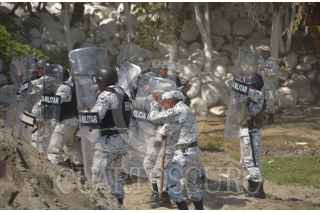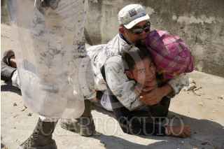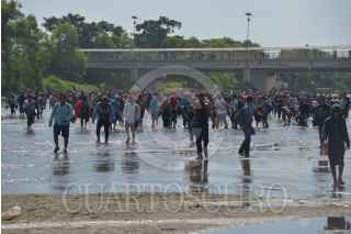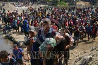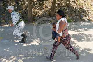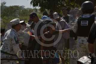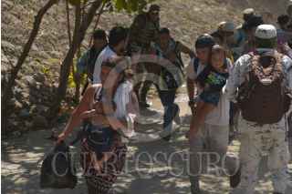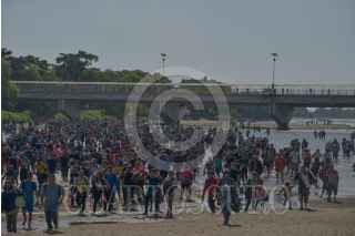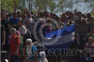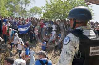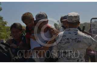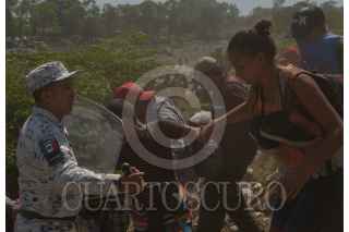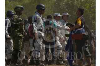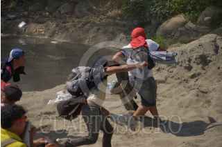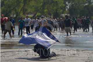 CIUDAD HIDALGO, CHIAPAS, 20ENERO2020.- Los migrantes centroamericanos que desde muy temprana hora salieron de varios albergues de lado de Guatemala decidieron pasar la frontera por el Río Suchiate, luego de que por el puente migratorio las autoridades mexicanas les impidieron el paso. Los viajeros que buscan llegar a Estados Unidos fueron contenidos por la Guardia Nacional en el bordo del río, ya del lado mexicano. Por momentos se presentaron algunos conatos de bronca, y varios hombres fueron detenidos por los elementos militares. FOTO: ISABEL MATEOS/CUARTOSCURO.COM