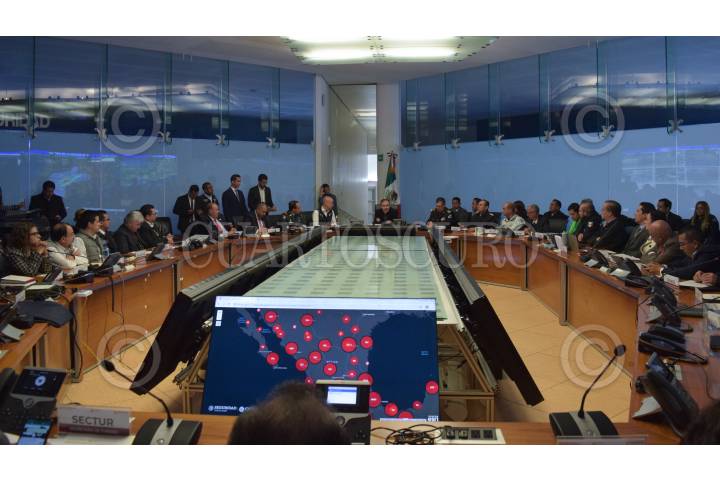 CIUDAD DE MÉXICO, 20ENERO2020.- El Gabinete del Comité Nacional de Emergencias, encabezado por Alfonso Durazo, secretario de Seguridad y Protección Ciudadana, realizó una conferencia de prensa minutos después del Macrosimulaco Nacional, en donde detalló que que se obtuvo una participación de poco más de 50 millones de personas, la colaboraron 587 mil 350 elementos de fuerzas armadas y dependencias del gobierno, principalmente de Protección Civil, si que se reportara ningún error significativo del simulacro, esto en el Búnker del Cuadrilátero y Protección Ciudadana. FOTO: ROGELIO MORALES /CUARTOSCURO.COM