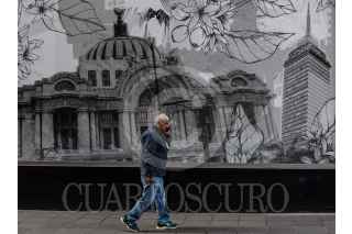 Un señor camina a lado de un póster del Palacio de Bellas Artes y la Torre Latinoamericana. FOTO: MARIO JASSO /CUARTOSCURO.COM