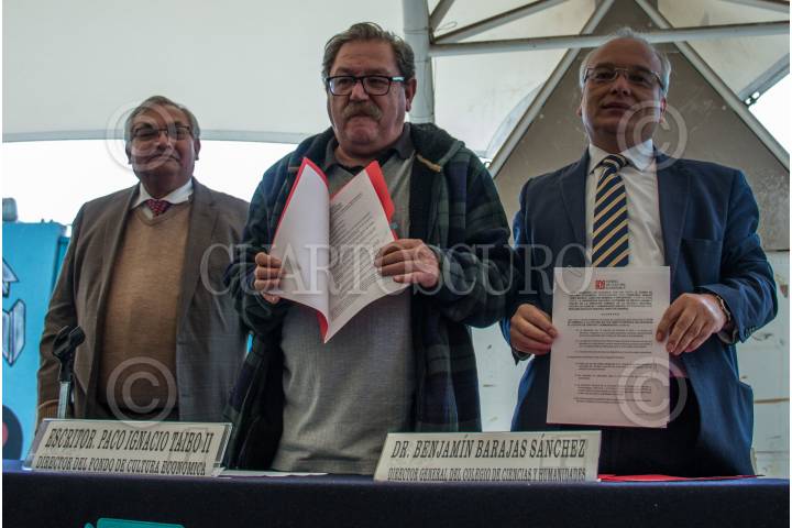 CIUDAD DE MÉXICO, 22ENERO2020.- Paco Ignacio Taibo II, director del Fondo de Cultura Económica (FCE)y Benjamin Barajas, director del Colegio de Ciencias y Humanidades Oriente (CCH), encabezaron la firma de convenio entre el FCE y CCH Oriente. Consiste en el asilo del camión itinerante de libros a precios con hasta el 90% de descuento, con el fin de incentivar a los jóvenes a leer. FOTO: ANDREA MURCIA /CUARTOSCURO.COM