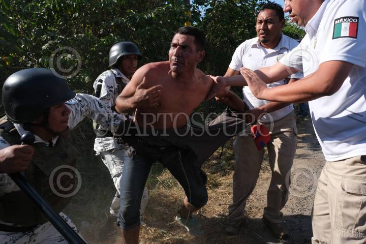 FRONTERA HIDALGO, CHIAPAS, 23ENERO2020.- Después de un diálogo con las autoridades mexicanas, la caravana que cruzó esta mañana por el río Suchiate fue detenida por al menos 300 elementos de la Guardia Nacional y elementos del Instituto Nacional de Migración. Con violencia fueron encapsulados en el área donde descansaban. Momentos después los hicieron subir a autobuses que esperan estaban estacionados en la carretera. Los migrantes denunciaron que las autoridades no les informaron a donde serían trasladados, al menos 600 migrantes fueron detenidos. FOTO: ISABEL MATEOS/CUARTOSCURO.COM
