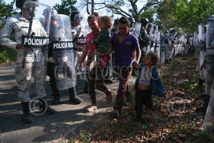 FRONTERA HIDALGO, CHIAPAS, 23ENERO2020.- Después de un diálogo con las autoridades mexicanas, la caravana que cruzó esta mañana por el río Suchiate fue detenida por al menos 300 elementos de la Guardia Nacional y elementos del Instituto Nacional de Migración. Con violencia fueron encapsulados en el área donde descansaban. Momentos después los hicieron subir a autobuses que esperan estaban estacionados en la carretera. Los migrantes denunciaron que las autoridades no les informaron a donde serían trasladados, al menos 600 migrantes fueron detenidos. FOTO: ISABEL MATEOS/CUARTOSCURO.COM