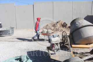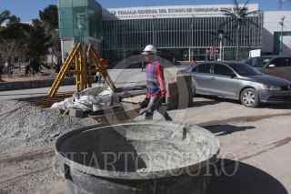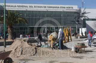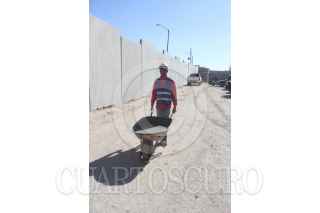 CIUDAD JUÁREZ, CHIHUAHUA, 24ENERO2020.- Obreros continúan construyendo una barda junto a la reja que delimita la propiedad de la Comisión Estatal de Seguridad, en el eje vial Juan Gabriel. Los trabajos, se indicó, continuarán hasta cubrir toda la parte delantera de las oficinas. A su vez, se dio a conocer que frente a la Fiscalía General del Estado también se colocará una barda para resguardarse de posibles enfrentamientos, esto después de que se registró un ataque contra agentes de la Policía Estatal que se encontraban en las instalaciones de la Fiscalía. FOTO: NACHO RUIZ/CUARTOSCURO.COM