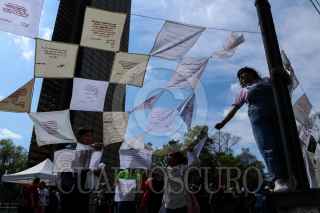 La Caravana por la Paz con Justicia y Dignidad encabezada por el activista y poeta Javier Sicilia y el activista Julian Lebarón, que arribó el día de ayer a la capital del país, realizó una jornada cultural en la Estela de Luz, esto previo a la marcha programada para el día de mañana. Entre las actividades destacaron la lectura de poesía, música, así como el bordado de los testimonios de familiares y testigos víctimas de la violencia en el país. FOTO: GALO CAÑAS /CUARTOSCURO.COM