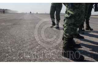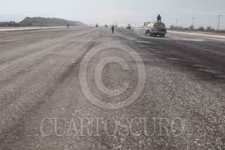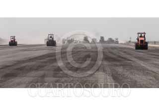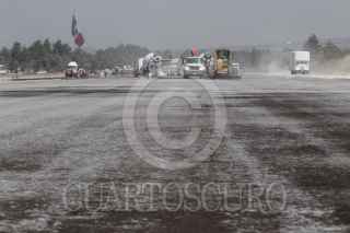 SANTA LUCÍA, ESTADO DE MÉXICO, 29ENERO2020.- A pesar de las tolvaneras que se levantan por el aire y la tierra suelta de las excavaciones en la construcción del Nuevo Aeropuerto Internacional Felipe Ángeles (AIFA) ya se aprecia la pista central que medirá 4500 metros de longitud y 45 metros de ancho, a su derecha se observa el cerro de Paula, cuya ubicación ha desatado gran polémica al asegurar que este no permitirá un adecuado despegue y aterrizaje de los aeronaves. Los militares responsables de lo obra aseguran que en los más de 68 años que ha operado la Base Aérea Militar de Santa Lucía jamás ha habido un accidente aéreo por esta razón. El aspecto grisáceo oscuro que tiene la pista se debe al basalto triturado que se recicló de las obras del NAIM en Texcoco, asegurando que todos los recursos se están eficientando al máximo. Uno de los responsables de la obra, el Mayor Ingeniero Constructor José Juan Marín Solís, vocero del Agrupamiento de ingenieros de la construcción de Santa Lucía, destaca que la longitud de las pistas del AIFA permitirá que las aeronaves puedan despegar a su máxima capacidad de carga y combustible, incluyendo aviones de grandes dimensiones como el Airbus 380. FOTO: MOISÉS PABLO/CUARTOSCURO.COM