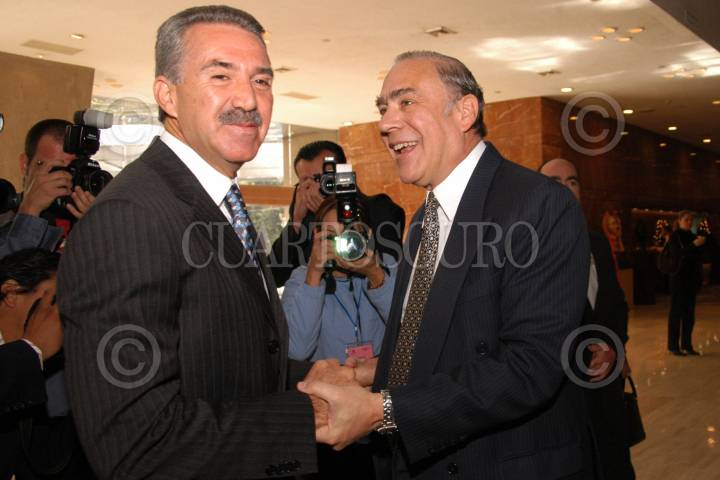 MEXICO, D.F. 29NOVIEMBRE2005.- Jeffrey Davidow, ex embajador de EUA; Larry Rubin, Presidente de American Chamber en México; Roberto Madrazo, candidato del PRI a la presidencia de la República y Jose Angel Gurría durante la convencion anual de la American Chamber. FOTO:Miriam Sánchez/CUARTOSCURO.COM