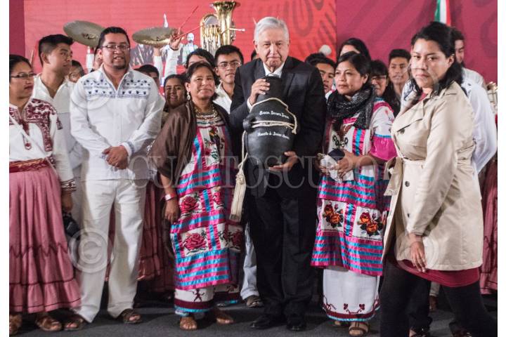 CIUDAD DE MÉXICO. 03FEBRERO2020.- El primer mandatario de la Nación, Andrés Manuel López Obrador, acompañado de Alejandra Frausto y Adelfo Regino Montes, entrego instrumentos musicales a jóvenes de Oaxaca y Guerrero escucho algunas interpretaciones de una orquesta compuesta por indígenas. Amenizaron la tradicional mañanera, que solo duró menos de una hora y dejo pendientes inquietudes de de los medios de información. FOTO: VICTORIA VALTIERRA/CUARTOSCURO.COM