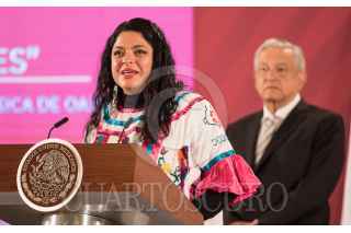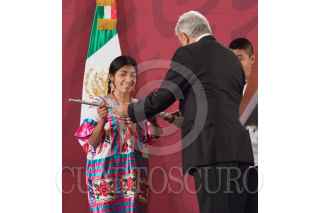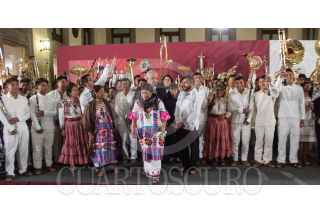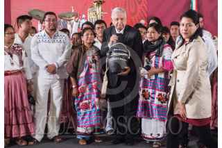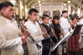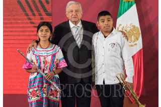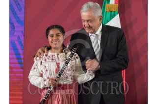 CIUDAD DE MÉXICO. 03FEBRERO2020.- El primer mandatario de la Nación, Andrés Manuel López Obrador, acompañado de Alejandra Frausto y Adelfo Regino Montes, entrego instrumentos musicales a jóvenes de Oaxaca y Guerrero escucho algunas interpretaciones de una orquesta compuesta por indígenas. Amenizaron la tradicional mañanera, que solo duró menos de una hora y dejo pendientes inquietudes de de los medios de información. FOTO: VICTORIA VALTIERRA/CUARTOSCURO.COM