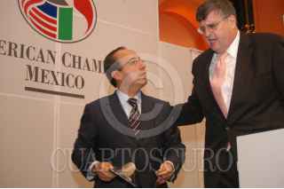 MÈXICO, D.F. 29NOVIEMBRE2005.- Felipe Calderòn Hinojosa, candidato del PAN a la presidencia de la Repùblica y Jeffrey Davidow, ex embajador de EUA de Mèxico durante la convención anual de la American Chamber. FOTO: Miriam Sànchez/CUARTOSCURO.COM