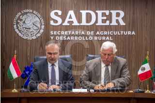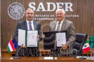 CIUDAD DE MÉXICO 04 FEBRERO 2020.- István Nagy, Miembro de la Asamblea Nacional de Hungría, y Víctor Villalobos Arámbula, titular de Agricultura, firmaron un memorando de entendimiento con el que se impulsará la promoción de la industria rural y de las actividades acuícolas directamente relacionadas con la producción de alimentos a través de tecnologías adaptadas a las necesidades de los pequeños productores, con énfasis en el estudio de sus efectos sobre el empleo rural, los costos de producción alternativos y la capacitación. FOTO: SADER /CUARTOSCURO.COM