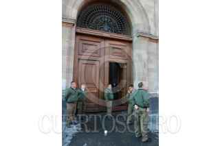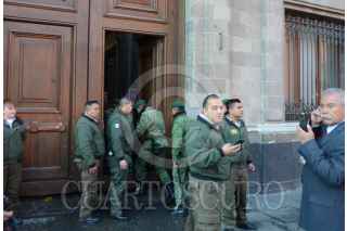 CIUDAD DE MÉXICO, 10FEBRERO2020.- Esta mañana fue vandalizada una puerta de Palacio Nacional, que se ubica en la calle de Moneda, supuestamente la agresión fue realizada por estudiantes de Normal Rural de Ayotzinapa "Raúl Isidro Burgos", quienes demandaban pase director en el reparto de plazas magisteriales. Los guardias de seguridad repelieron a los inconformes con gas pimienta. FOTO: ARMANDO MONROY/CUARTOSCURO.COM