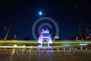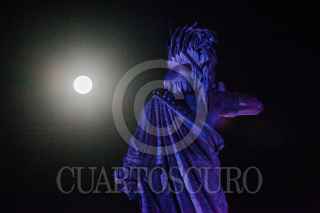 CIUDAD DE MÉXICO, 11FEBRERO2020.- La luna suspendida en la noche de la Cuidad de México. Monumetos y estatauas son bañados con la luz que cae del satélite natural de la tierra. En una foto observamos al último tlatoani mexica, Cuauhtémc, convertido en piedra, observando la luna cual sigiloso cazador nocturno. Nacido alrededor de 1500, fue hijo de Ahuítzotl, octavo tlatoani mexica, y de Tilacápatl, hija de Moquíhuix, útlimo gobernante de Tlatelolco. Según expertos en el tema, su nombre puede ser traducido, literalmente, como "águila que desciende", según otros, al ser el águila un animal asociado, en tiempos prehispánicos, con el sol, puede ser también traducido como "Sol que desciende". ¿Será que la estatua contempla su ocaso, que es también renacimiento, en el cíclico tiempo de los antiguos calendarios?. TEXTO: PEDRO ANZA/CUARTOSCURO.COM FOTO: JUAN PABLO ZAMORA/CUARTOSCURO.COM