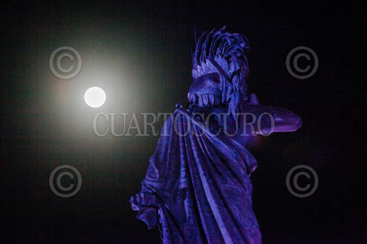 CIUDAD DE MÉXICO, 11FEBRERO2020.- La luna suspendida en la noche de la Cuidad de México. Monumetos y estatauas son bañados con la luz que cae del satélite natural de la tierra. En una foto observamos al último tlatoani mexica, Cuauhtémc, convertido en piedra, observando la luna cual sigiloso cazador nocturno. Nacido alrededor de 1500, fue hijo de Ahuítzotl, octavo tlatoani mexica, y de Tilacápatl, hija de Moquíhuix, útlimo gobernante de Tlatelolco. Según expertos en el tema, su nombre puede ser traducido, literalmente, como "águila que desciende", según otros, al ser el águila un animal asociado, en tiempos prehispánicos, con el sol, puede ser también traducido como "Sol que desciende". ¿Será que la estatua contempla su ocaso, que es también renacimiento, en el cíclico tiempo de los antiguos calendarios?. TEXTO: PEDRO ANZA/CUARTOSCURO.COM FOTO: JUAN PABLO ZAMORA/CUARTOSCURO.COM