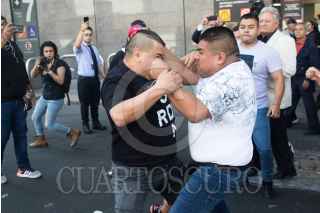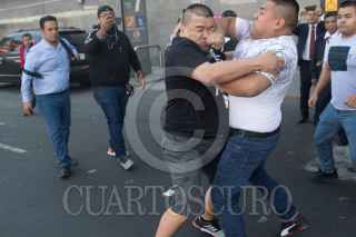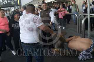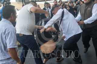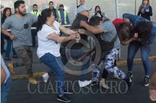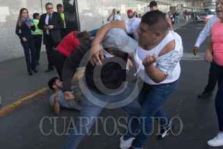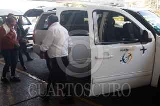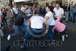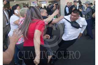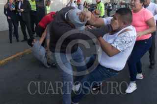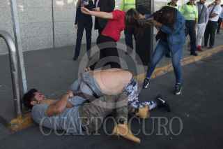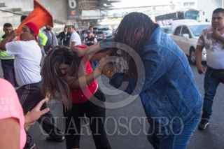 CIUDAD DE MÉXICO, 11FEBRERO2020.- Guadalupe Espinoza, representante de la Unión de Mujeres Concesionaria de Flotilla de Taxis y Mujeres Taxistas del Aeropuerto Internacional de la Ciudad de México, ofreció una conferencia de prensa en donde denunció intimidación machista y acoso sexual por parte de otros grupos de taxistas y de las propias autoridades del aeropuerto, cuando un grupo de mujeres, identificadas con la empresa PortoTaxis, le gritaron que era ella y su grupo los que se quieren apoderar de su espacio en la bahía. De los insultos entre ambos grupos pasaron a los golpes, ambos se acusaron mutuamente de querer apoderarse del espacio que tienen en la bahía de descensos. Policías y vigilantes del aeropuerto intentaron dispersarlos, durante la trifulca buscaron llevar la bronca al interior de las instalaciones, por lo que tuvieron que cerrar las puestas del acceso 7 del aeropuerto. FOTO: MOISÉS PABLO/CUARTOSCURO.COM