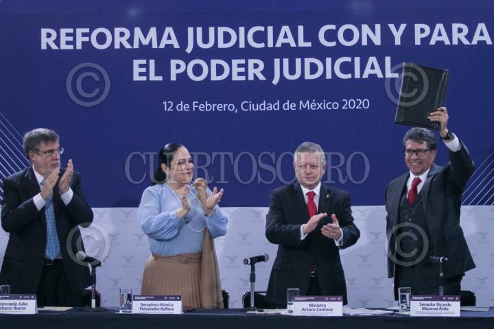 CIUDAD DE MÉXICO, 12FEBRERO2020.- Ante la Suprema Corte de Justicia de la Nación fue presentada la propuesta de Reforma Constitucional en materia Judicial, la cual fue firmada en primeras horas del día por el jefe del ejecutivo, Andrés Manuel López Obrador, y será enviada al pleno del Senado para su aprobación. El acto protocolario estuvo encabezado por Julio Scherzer Ibarra, consejero jurídico de la presidencia; Mónica Fernández Balboa, presidenta de la mesa directiva del Senado; Arturo Zaldívar, ministro presidente de la Suprema Corte de Justicia de la Nación, y Ricardo Monreal, presidente de la Junta de Coordinación Política del Senado (JUCOPO). Dicha propuesta tiene se centra en el combate contra la corrupción y el nepotismo, así como busca conseguir la paridad de género y el fortalecimiento de los defensores públicos para el auxilio legal de los sectores más vulnerables. FOTO: GALO CAÑAS /CUARTOSCURO.COM