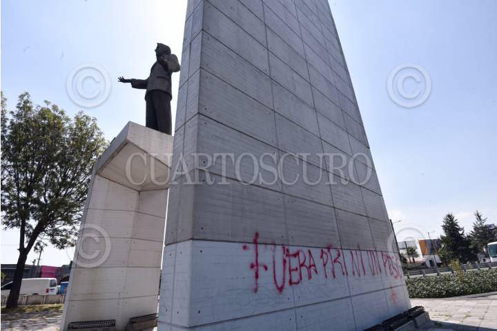 El monumento a Carlos Hank Gonzalez ex gobernador del Estado de México, ubicado en los carriles centrales de Paseo Tollocan amaneció con pintas contra el tarifazo en el Edomex. FOTO: CRISANTA ESPINOSA AGUILAR /CUARTOSCURO.COM