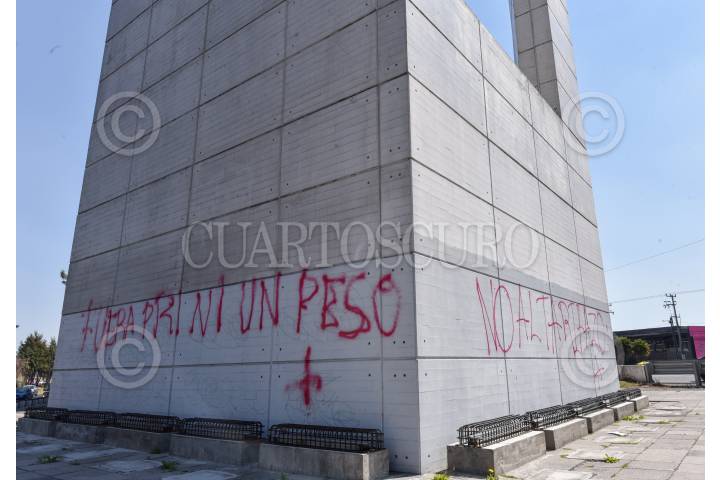El monumento a Carlos Hank Gonzalez ex gobernador del Estado de México, ubicado en los carriles centrales de Paseo Tollocan amaneció con pintas contra el tarifazo en el Edomex. FOTO: CRISANTA ESPINOSA AGUILAR /CUARTOSCURO.COM