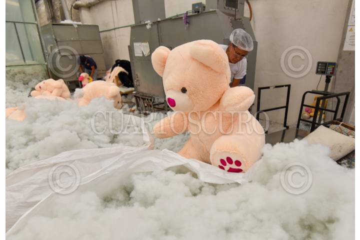 A pesar de que las ventas de osos de peluche han bajado a unos días de celebrarse el Día del Amor y la Amistad, la producción se mantuvo al mismo ritmo en el municipio de Xonacatlán; el Grupo Andy Toys iniciadores de la industria del peluche mantuvo sus precios aunque tuvo incremento en su materia prima, y están fabricando alrededor de 2000 mil muñecos de peluche al día, para tener listos los regalos para los enamorados de este 14 de febrero. Peluches de todos los tamaños y precios se pueden encontrar en este municipio que se ha caracterizado por trabajar estos productos. FOTO: CRISANTA ESPINOSA AGUILAR /CUARTOSCURO.COM