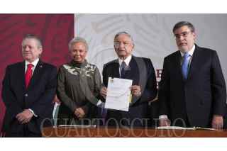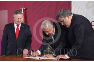 CIUDAD DE MÉXICO, 12FEBRERO2020.- Arturo Zaldívar Lelo de Larrea, ministro presidente de la Suprema Corte de Justicia de la Nación; Andrés Manuel López Obrador, Presidente de México, y Julio Scherer Ibarra, Consejero Jurídico de la Presidencia, durante la firma de la propuesta de reforma judicial del Poder Judicial de la Federación, que fue presentada por la SCJN al Ejecutivo, que la hizo suya ya que la Corte no tiene facultad de presentar iniciativas. En el acto estuvó presente Olga Sánchez Cordero, Secretaría de Gobernación. FOTO: PRESIDENCIA/CUARTOSCURO.COM