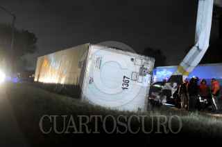 Cuautitlán Izcalli, Estado de México, 14 febrero2020. Al circular un tráiler con doble remolque sobre la autopista México Querétaro en el Km. 33+500, se le des engancha la segunda caja e impacta contra un poste de nomenclatura y vuelca, del accidente no hubo personas lesionadas. Foto: Luis Carbayo/cuartoscuro.com
