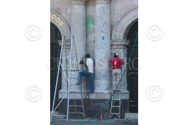 Realizan trabajos de limpieza en la Cámara de Diputados y Palacio Municipal después de las pintas que se hicieron en estos edificios por manifestantes contra el Tarifazo. FOTO: CRISANTA ESPINOSA AGUILAR /CUARTOSCURO.COM