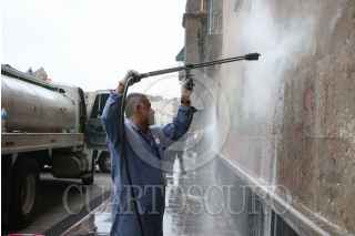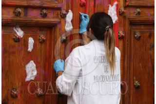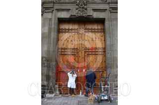 CIUDAD DE MÉXICO, 14FEBRERO2020.- Trabajadores de la ciudad y expertos del Instituto Nacional de Antropología e Historia comenzaron los trabajos de limpieza de la Puerta Mariana y fachada de Palacio Nacional luego de que un grupo de mujeres encapuchadas pintara con aerosol consignas en contra de los feminicidios en todo el país. FOTO: ROGELIO MORALES /CUARTOSCURO.COM