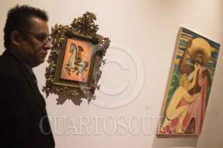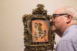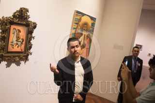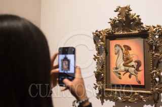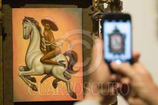 CIUDAD DE MÉXICO, 16FEBRERO2020.- Hoy concluye la exposición "Emiliano. Zapata después de Zapata" que se encuentra en el Palacio de Bellas Artes. Dentro de esta muestra se encuentra el cuadro "La Revolución 2014", del pintor Fabián Cháirez, el cual desató la polémica al presentar al llamado Caudillo del Sur montado en un caballo blanco con una erección y en una pose femenina con tacones. Las personas que observan el cuadro se toman una foto con la pieza o bien le toman una foto. El día de ayer integrantes dela UNTA bloquearon los accesos al recinto, esta agrupación pidió el retiro de esta obra. FOTO: MOISÉS PABLO/CUARTOSCURO.COM