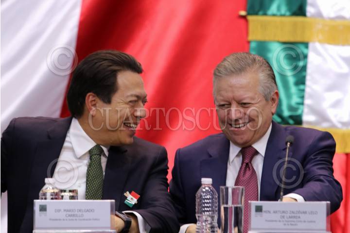 CIUDAD DE MÉXICO, 25FEBRERO2020.- Mario Delgado, coordinador de Morena; el ministro Arturo Zaldívar Lelo de la Rea; Laura Rojas, presidenta de la Mesa directiva en la Cámara de Diputados; la vicepresidenta Dolores Padierna, y los coordinadores de los diferentes partidos asistieron a la presentación del proyecto de Reformas con y para el poder Judicial de la Federación, la cual se realizó en el Salón Legisladores en la Cámara de Diputados. FOTO: GRACIELA LÓPEZ /CUARTOSCURO.COM