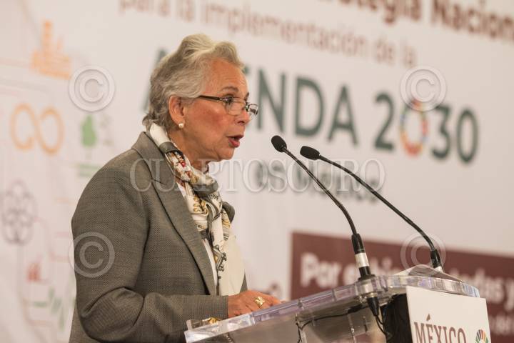 CIUDAD DE MÉXICO, 26FEBRERO2020.- Olga Sánchez Cordero, secretaria de Gobernación; Alfonso Romo Garza, jefe de la Oficina de la Presidencia de la República; Marcelo Ebrard Casaubón, secretario de Relaciones Exteriores; Laura Roas Hernández, presidenta de la mesa directiva en la Cámara de Diputados; Abel Hibert Sánchez, subjefe de innovación y análisis; Nancy de la Sierra Arámburo, representante de la mesa directiva del Senado de la República; María Luisa Albores, secretaria de Bienestar e Ignacio Peralta Sánchez, gobernador de Colima presidente de la Comisión Agenda 2020 de la CONAGO, durante el Lanzamiento de la Estrategia Nacional para la implementación de la Agenda 2030 en México. FOTO: INE/CUARTOSCURO.COM