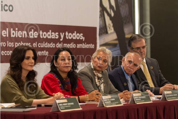 CIUDAD DE MÉXICO, 26FEBRERO2020.- Olga Sánchez Cordero, secretaria de Gobernación; Alfonso Romo Garza, jefe de la Oficina de la Presidencia de la República; Marcelo Ebrard Casaubón, secretario de Relaciones Exteriores; Laura Roas Hernández, presidenta de la mesa directiva en la Cámara de Diputados; Abel Hibert Sánchez, subjefe de innovación y análisis; Nancy de la Sierra Arámburo, representante de la mesa directiva del Senado de la República; María Luisa Albores, secretaria de Bienestar e Ignacio Peralta Sánchez, gobernador de Colima presidente de la Comisión Agenda 2020 de la CONAGO, durante el Lanzamiento de la Estrategia Nacional para la implementación de la Agenda 2030 en México. FOTO: INE/CUARTOSCURO.COM